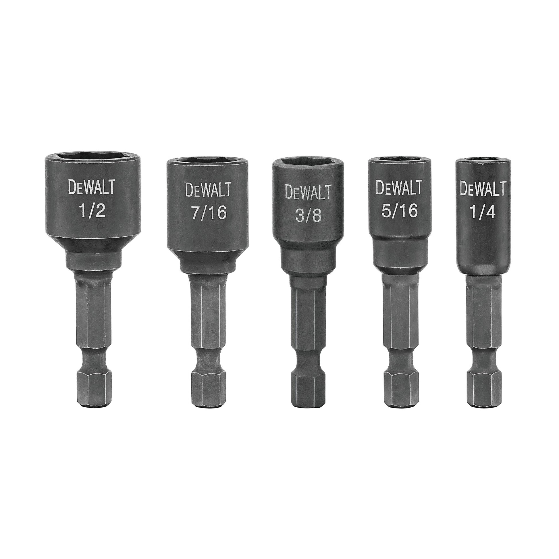 DEWALT Impact-Ready Magnetic Nut Driver Set (5-Piece) is built with patented geometry that reduces rounding of the hex.It's made with an advanced hardening process that provides maximum durability. The extra-strength magnets provide strong bit retention.