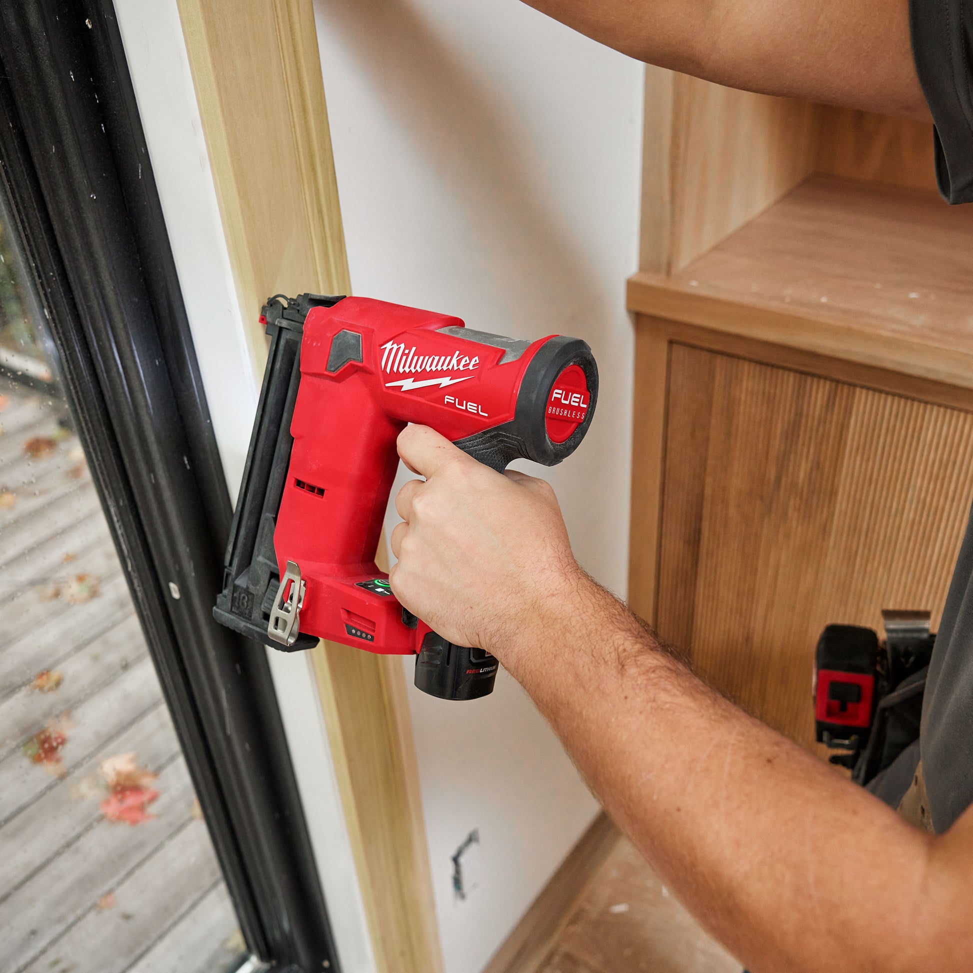 The Milwaukee M12 FUEL™ 18 Gauge Compact Brad Nailer delivers peak productivity at the jobsite, providing users with unmatched nailing performance & access to tight spaces with the compact, lightweight, ergonomic design. Leveraging a nitrogen air spring mechanism, this brad nailer enables our users to sink 5/8” – 1-½” brad nails to the proper depth in both hard and soft materials while leaving clean, consistent nail holes. Because of the compact design, our M12 FUEL™ 18 Gauge Compact Brad Nailer delivers the most access of any cordless brad nailer in the lightest weight design at only 4.6lbs when paired with our M12 REDLITHIUM™ 2.0 battery.