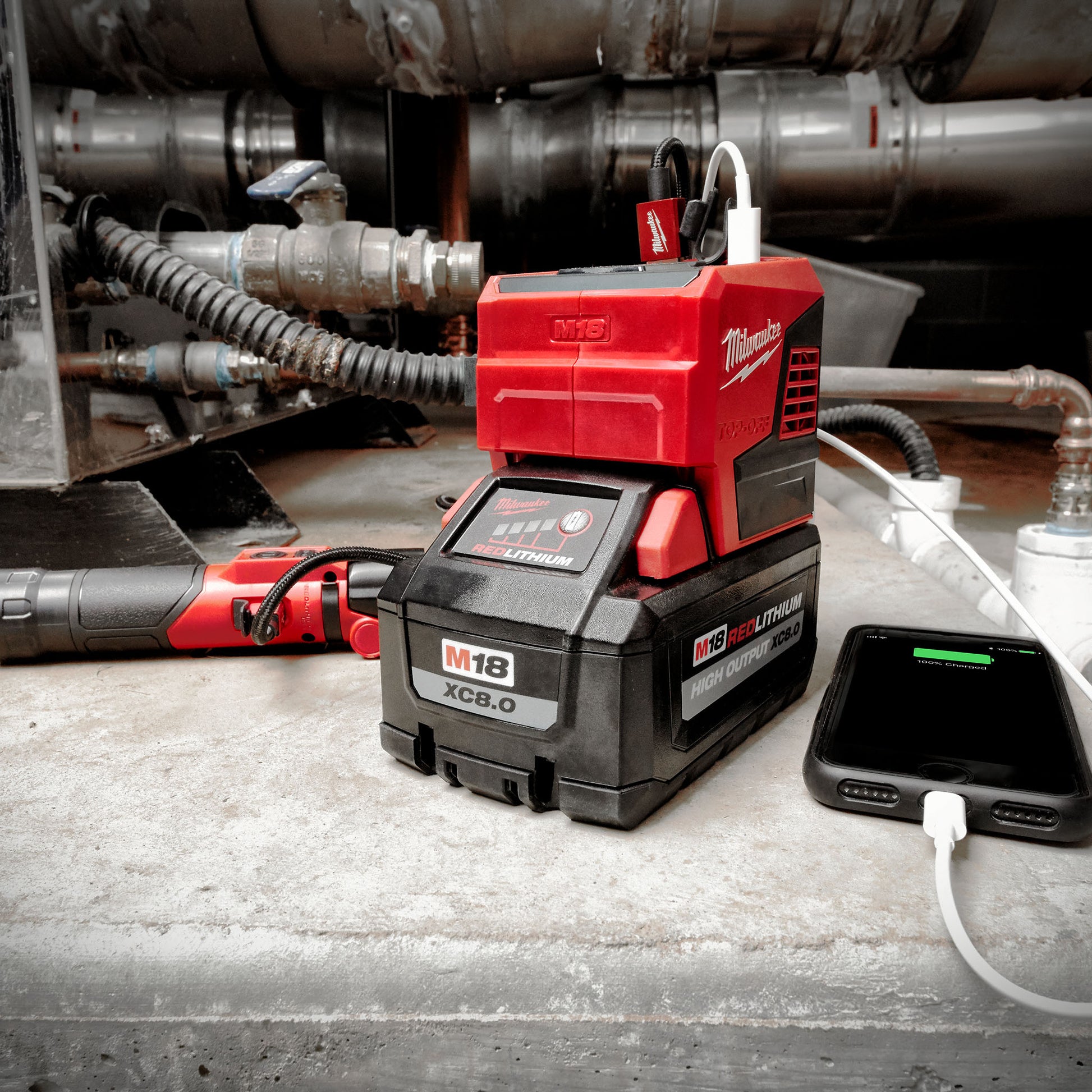 The Milwaukee M18™ TOP-OFF™ 175W Power Supply delivers faster simultaneous power to personal devices and small electronics. Attach any M18™ battery to provide continuous power or recharge devices with (1) AC 120V outlet, (1) USB-C PD port, and (1) USB-A port. You can quickly charge up to three devices at the same time, without the barriers of speed throttling. With the USB-C PD port (45W), this battery inverter is capable of recharging devices, from a fully depleted state to 80% capacity, up to 75% faster than conventional wall chargers (5W). The MILWAUKEE® compact portable power supply has an attached metal rafter hook that can be extended to hang it from carts, lumber, or other jobsite materials when worksurface space is limited. You can instantly set up a mobile workstation or keep electronics securely within eyeshot, rather than making frequent trips to a wall outlet.