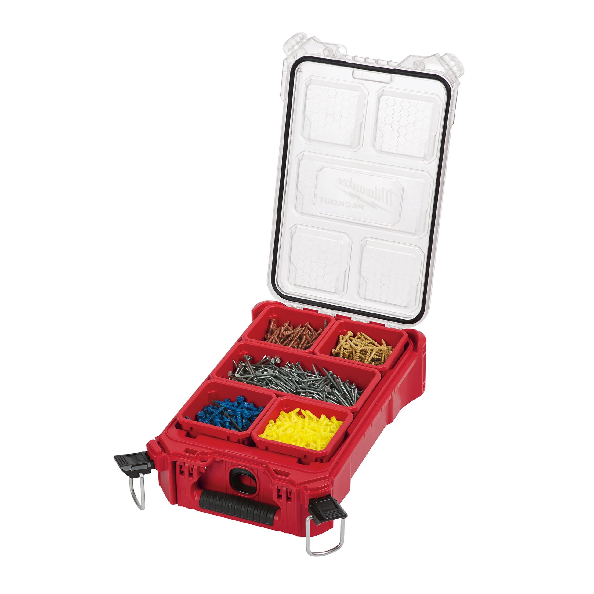 The Milwaukee Our PACKOUT™ modular storage system is the industry's most durable and versatile storage system. The PACKOUT™ compact organizer is constructed with impact resistant materials so it can withstand harsh jobsite environments. An IP65 rated weather seal protects your tools, accessories, and small parts from rain and other jobsite debris. The small organizer's interior features 5 removable storage bins that are easily mountable on the jobsite for quick access. The transparent lid of the organizer seals the bins to prevent contents from migrating and shifting during transport. Heavy duty latches and reinforced hinges ensure that the compact organizer keeps the contents contained and protected. Our PACKOUT™ modular storage allows you to customize and build your own storage system to easily transport and organize your tools and accessories.